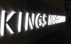 文字線が細い箱文字などにLEDを組み込むことが難しい場合は象嵌看板で製作する方法もあります。ステンレス板を文字の形切抜き裏側から10ミリ厚のアクリル切り文字を組み込んだ看板で、アクリル切り文字の正面、側面を発光させることが可能です。